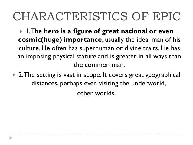 Emerges victorious from dangerous situations. Reflects timeless values and universal themesHero also has characteristics that reflect on ideals of society 5. Everything about an epic is big.