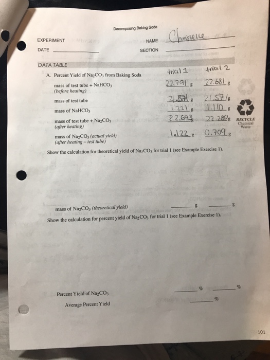 Decomposition of baking soda lab answer key I understand that the correct equation is the first to produce sodium carbonate. Calculate the percent yield for your experiment. In this lab we needed to know how to find molar masses and convert that to molecules.