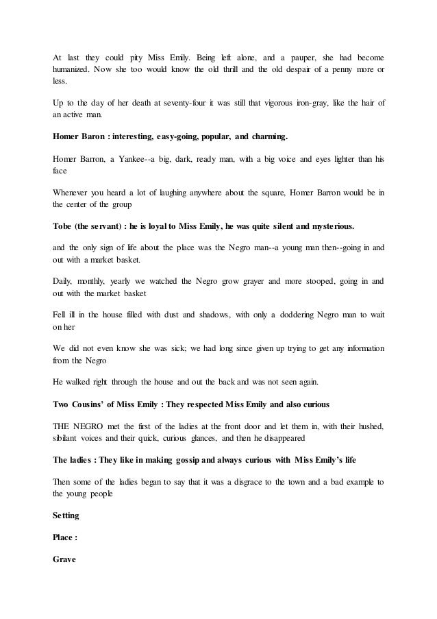 It has many underlying themes and tones whether intentional or not and most particularly in relation to the main character Emily Grierson. View A Rose for Emilydocx from A EN MISC at Bulacan State University-Malolos. They had to take care of their husbands children and homes.